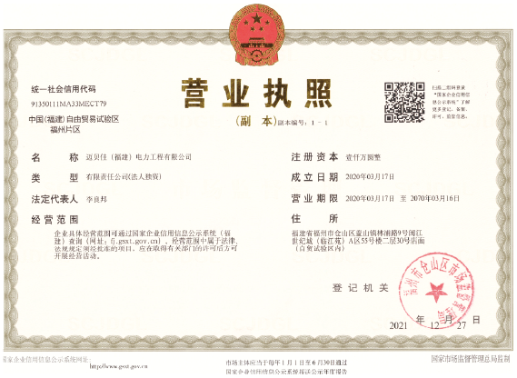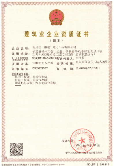 迈贝佳(福建)电力工程有限公司是光伏行业领军企业——迈贝特新能源的子公司,公司成立于2020年。公司秉承“持续创新、卓越品质、突破自我、融合共赢”的企业精神,以光伏电站项目建设和服务为核心业务,拥有电力工程施工总承包叁级、机电工程施工总承包叁级、建筑机电安装工程专业承包叁级、承装修试电力资质四级等资质。